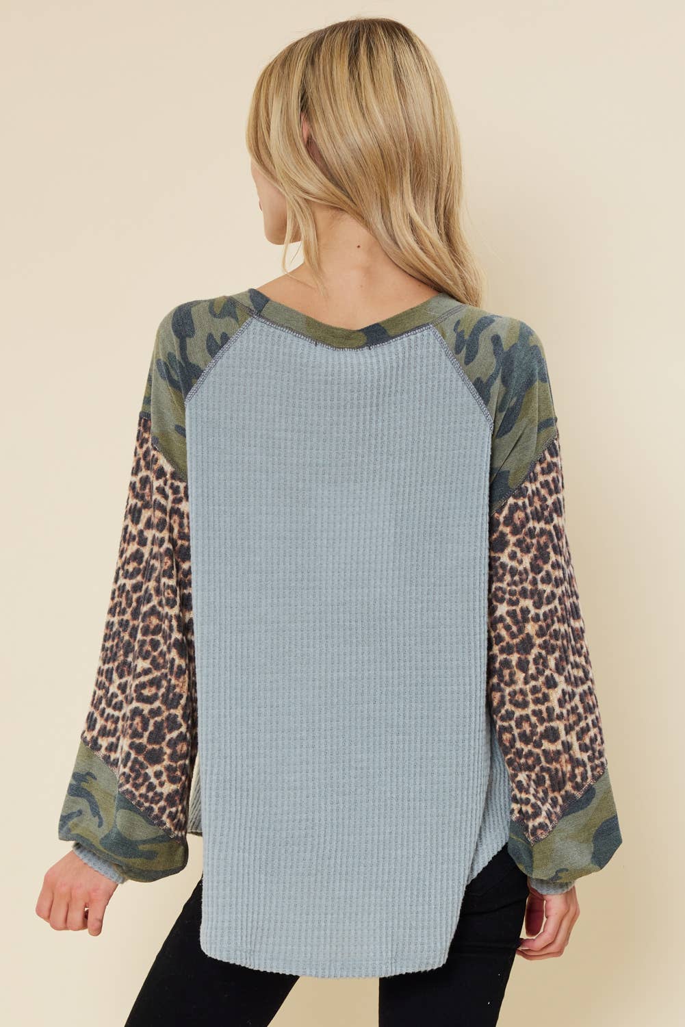 SOLID WAFFLE TOP FEATURING CAMO AND ANIMAL CONTRAST SLEEVES