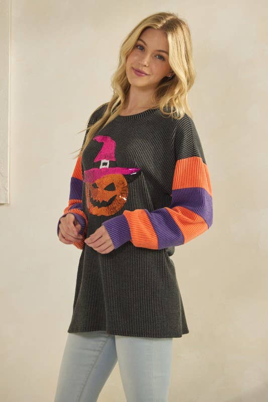 LONG SLEEVE SOLID URBAN RIB CONTRAST TOP WITH HALLOWEEN PUMKIN SEQUINS PATCH