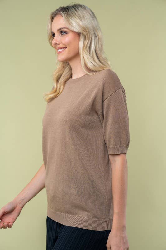A short-sleeve solid knit top with a round neck featuring a ribbed knit hem and a relaxed fit. Fabric is a lightweight sweater knit.